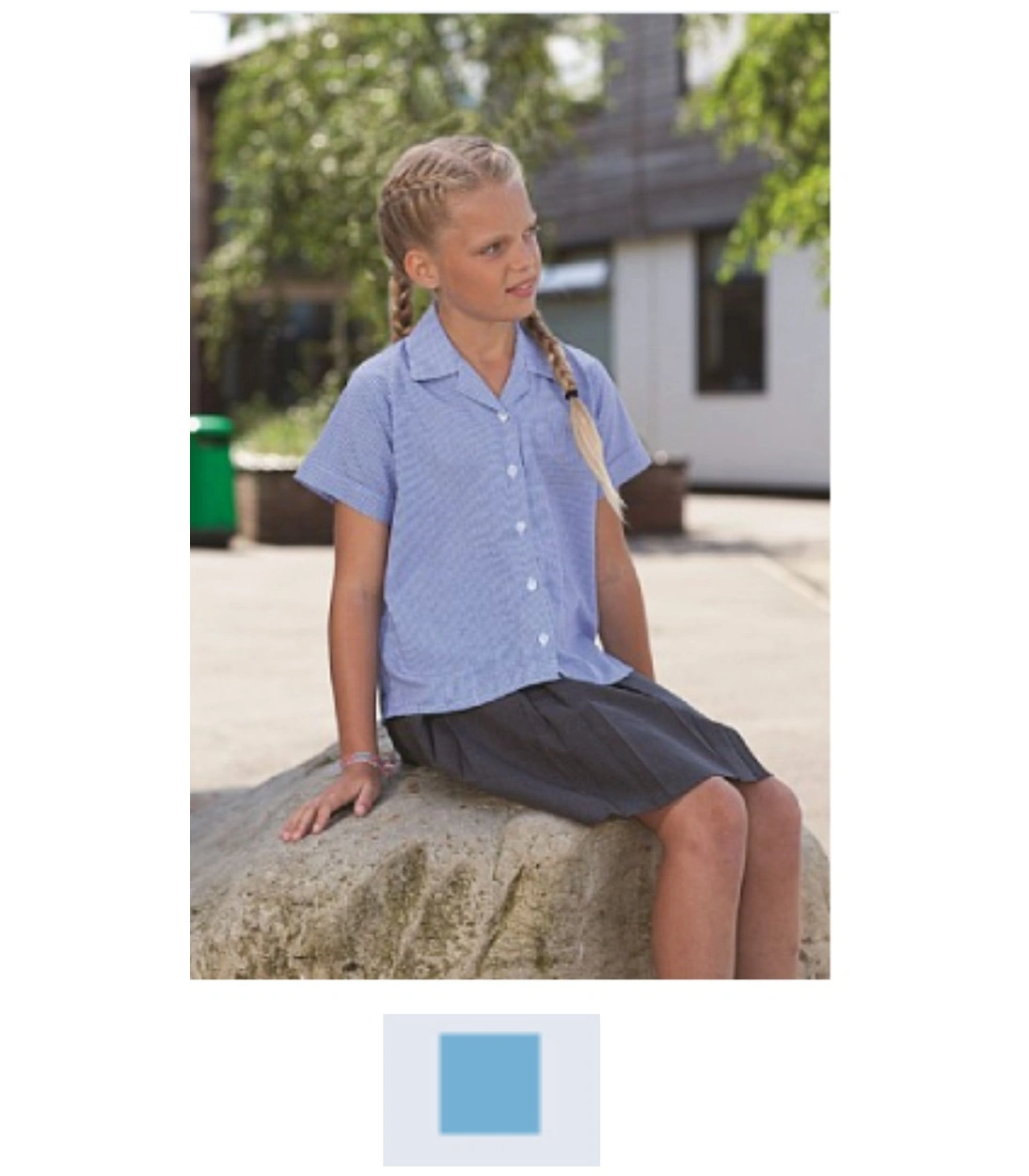 Short sleeve revere collar in 65/35% polyester/cotton, 1/16" gingham check in blue, available in sizes 3/4 years, 4/5 years, 5/6 years, 6/7 years, 7/8 years, 8/9 years, 9/10 years, 10/11 years, 11/12 years, 12/13 years, 34" chest and 36" chest.