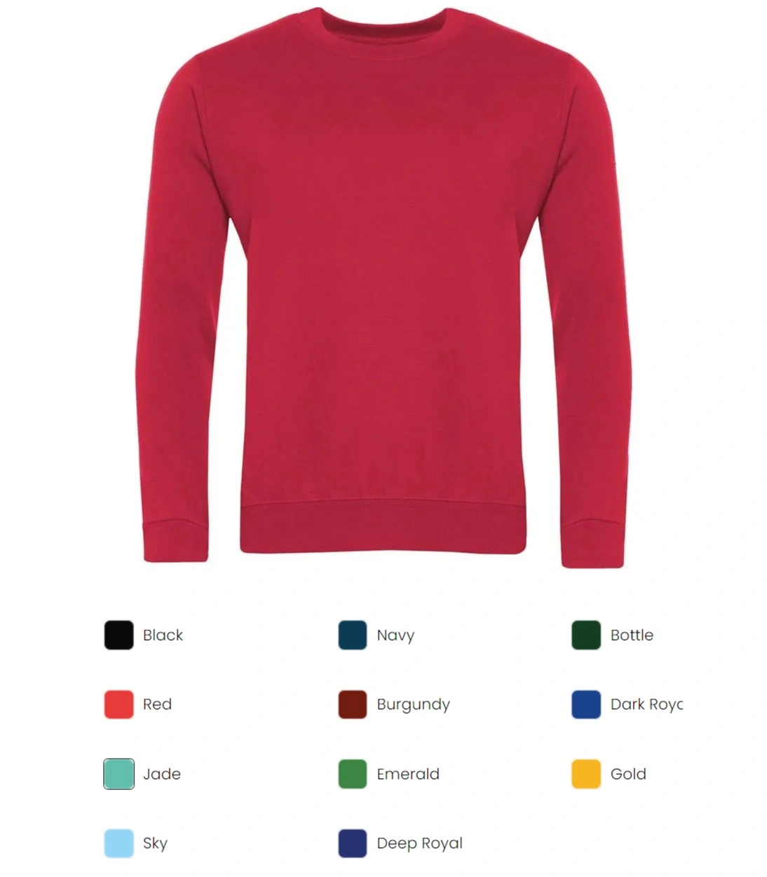 320gsm 65/35% cotton/poly fleece, twin needle stitching throughout, set in sleeves, ribbedcollar, cuffs & waistband, taped neck band.