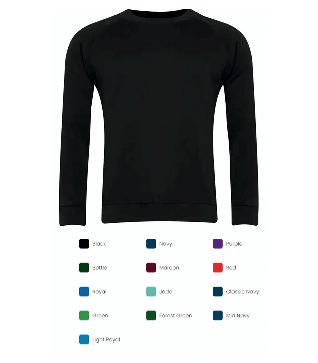 65/35% 280gsm poly/cotton, raglan sleeves, ribbed welt and cuffs, twin needle stitched seams, available in Small, medium, large, XL, XXL in red, black, navy, purple, bottle, maroon , royal, bottle, jade, classic navy, green, forest green, mid navy, light royal