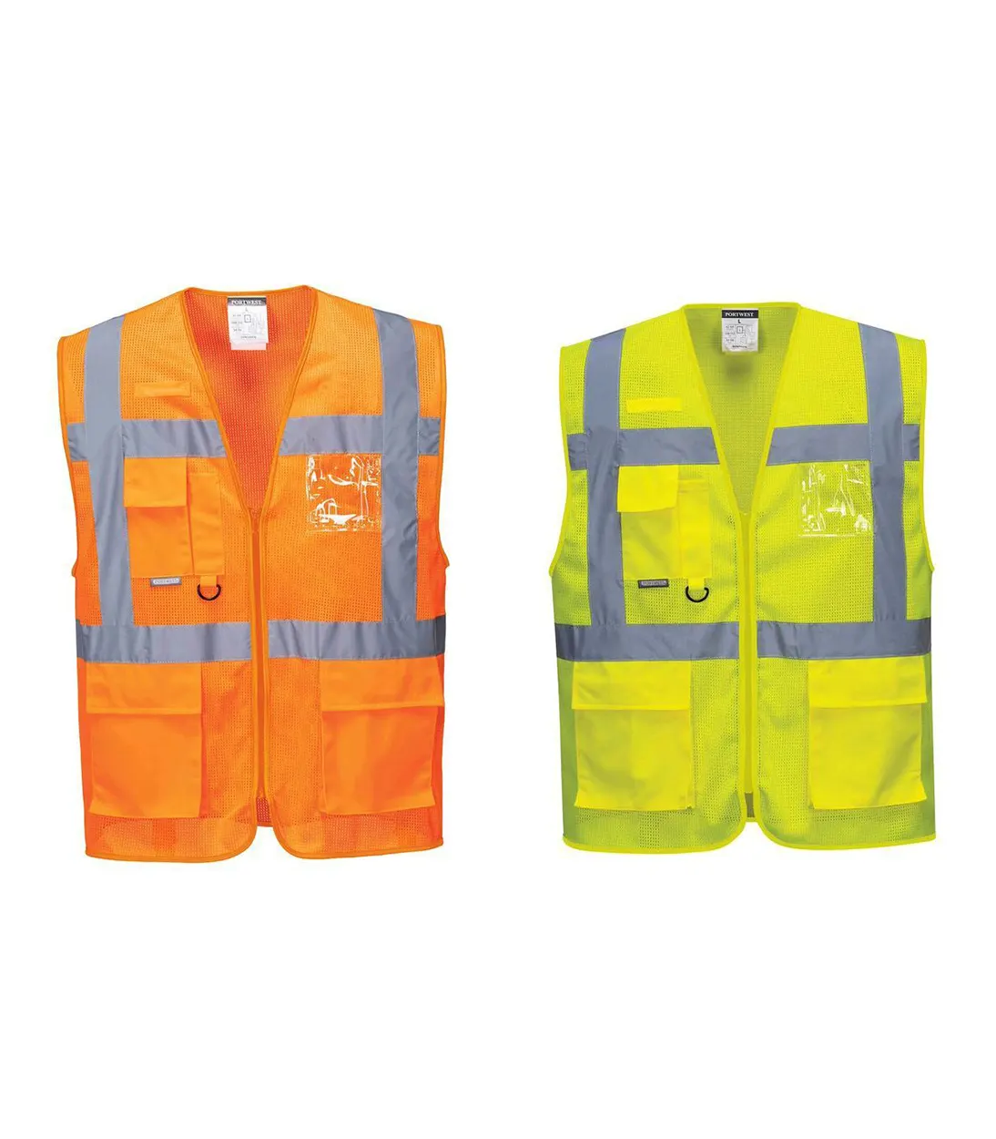 Advanced MeshAir technology ensures excellent airflow keeping the wearer cool at all times. MeshAir fabric is also fully compliant with EN ISO 20471. This vest incorporates classic executive features including multiple pockets, ID holder, radio loop and zipped front for easy access.