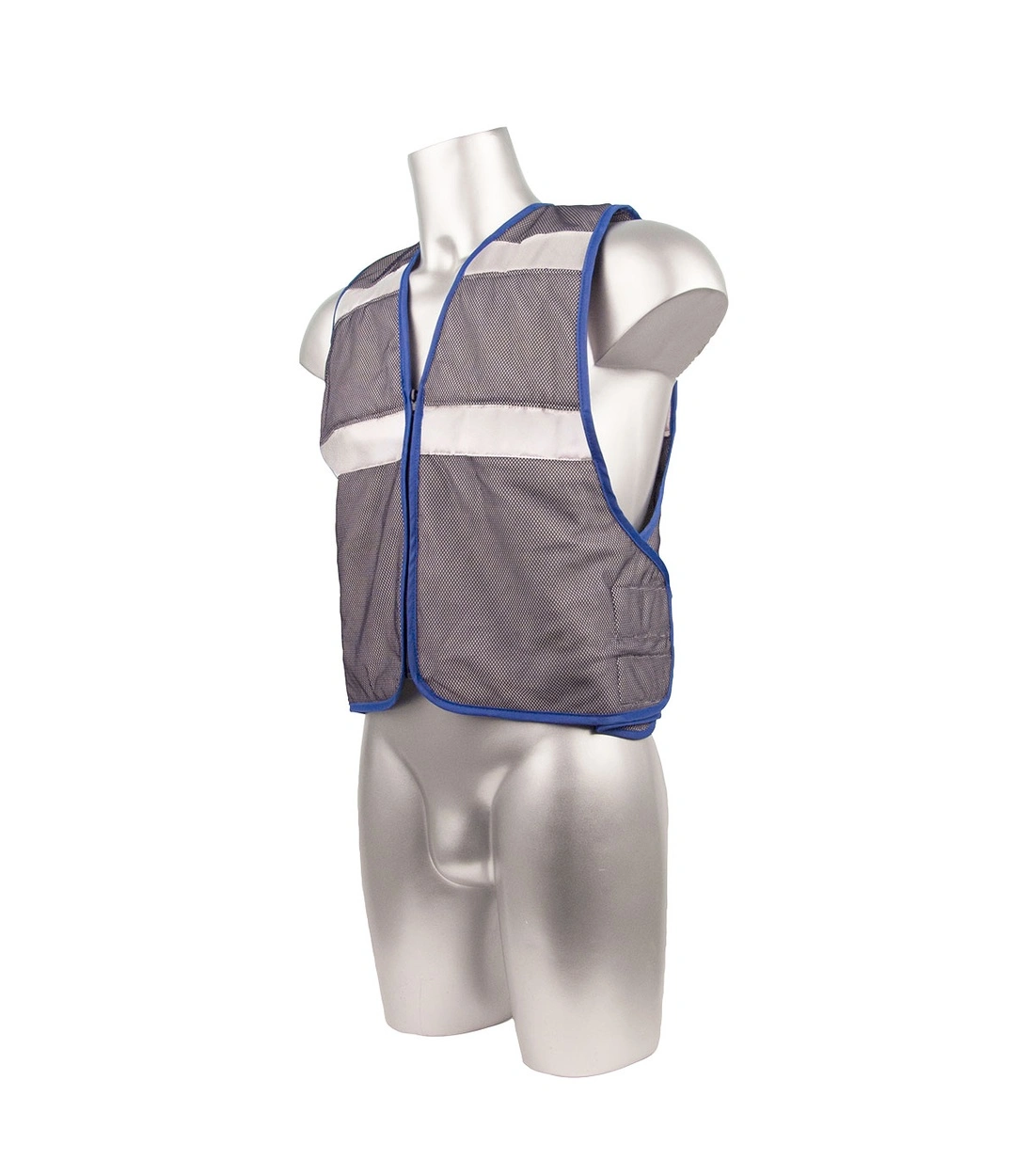 Simply saturate the vest in water and then squeeze to remove any excess water. The vest can then be worn and will not dampen any cloths underneath. When vest becomes dry, simply repeat for a further 8 hours of cool comfort. Polyester mesh, PVA padding, bamboo yarn, adjustable velcro sides ensures one size fits all. Colour grey with blue trim