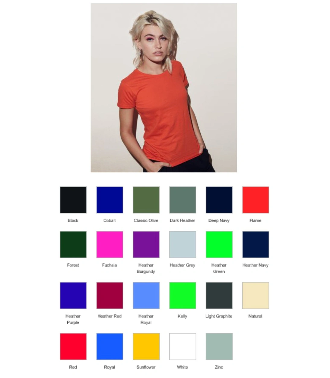 - Colours black, white, deep navy, heather navy, cobalt, royal, heather royal, heather purple, forest,kelly, heather green, classic olive, dark heather, light graphite, zinc, heather grey, natural, heather burgundy, heather red, red, flame, fuschia, sunflower