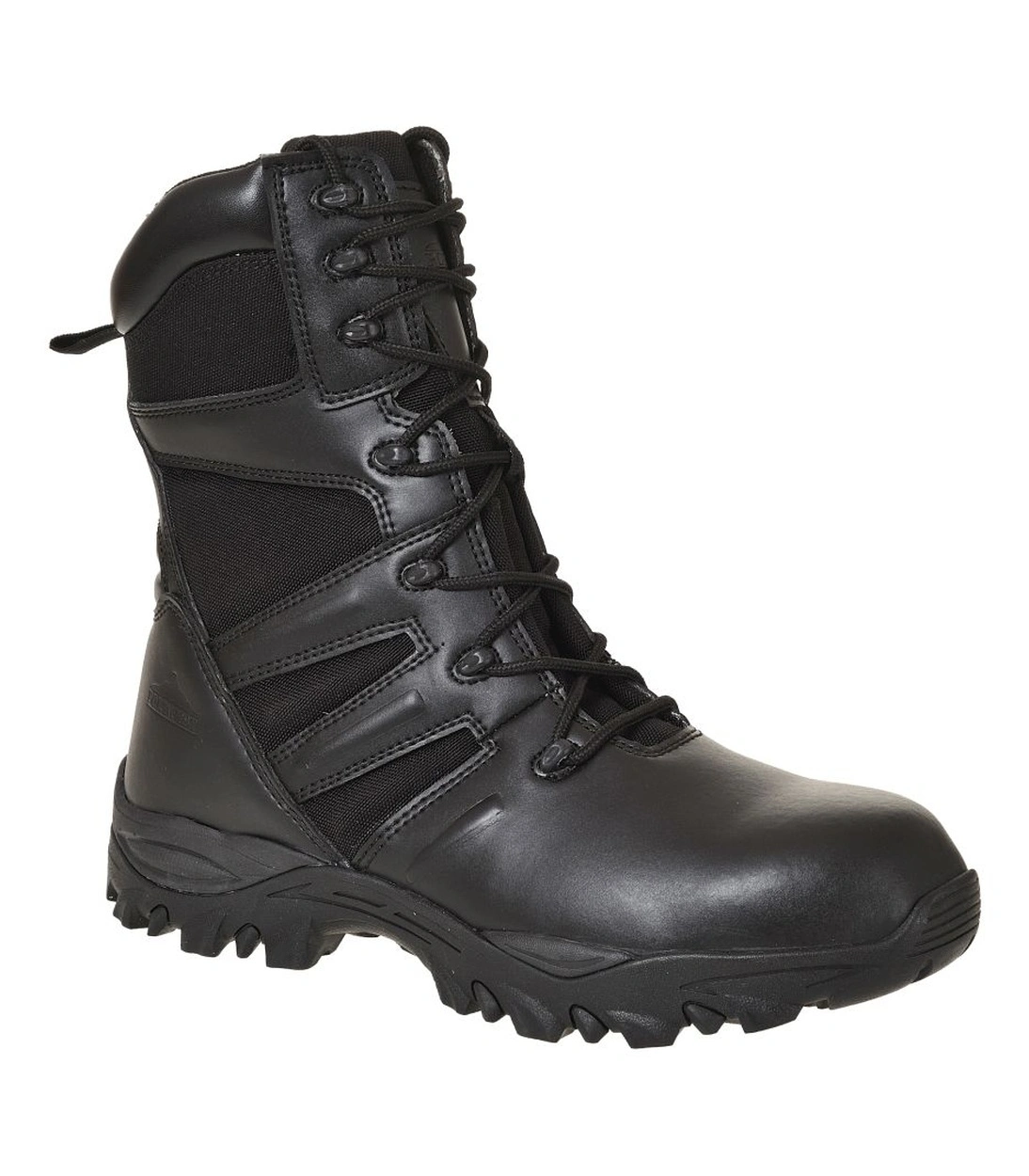 • Antistatic footwear • CE certified • Energy absorbing seat region • Oil resistant outsole • Steel midsole • Water resistant upper • Wide fitting • 200 Joule steel toecap • Heat resistant outsole – 300 • Slip resistant outsole (SRC) Description: Designed for optimum wearer comfort, the EVA/ Rubber heat resistant cemented outsole is highly durable. The water resistant upper combined with the breathable inner lining ensures maximum comfort for the wearer even when worn for long durations. Suitable for military and security personnel.  Sizes 6 – 13