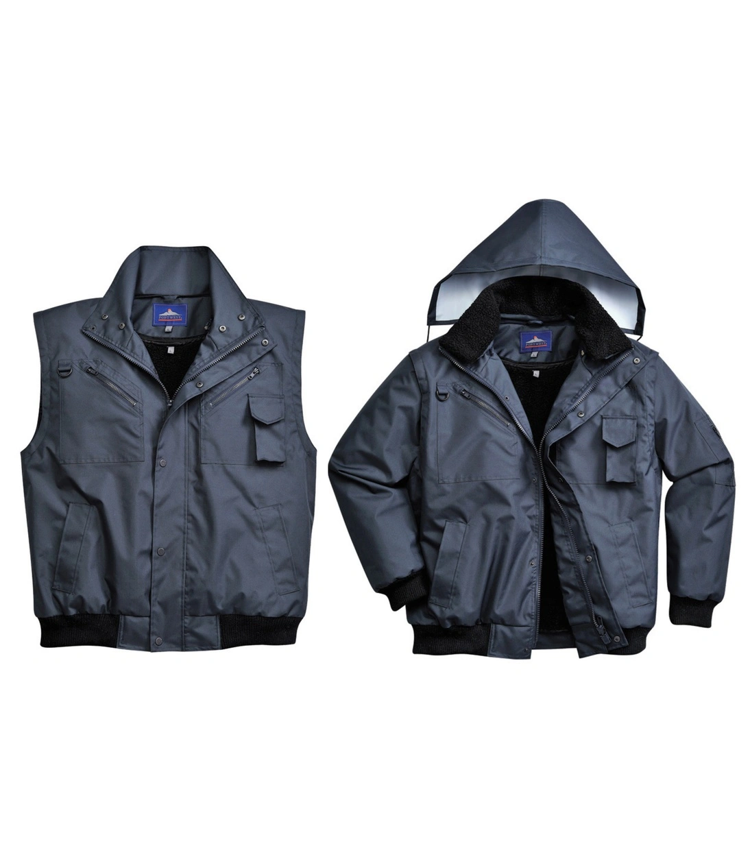 Versatile and comfortable protectionagainst all weather conditions. detachable fur liningand collar in combination with the zip out sleeves, prove this is a superblyadaptable garment, numerous zipped outer and interior pockets afford excellent personal security. 100% polyester Oxford weave with stain resistant finish. available in navy in sizes Small, medium, large, XL, XXL, 3XL