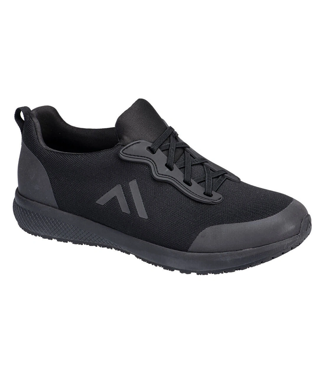 This lightweight occupational trainer is 100% metal free, and has an upper in stretchy textile aiding a more snug fit. It has a dual density phylon rubber outsole for superior grip and energy absorption.