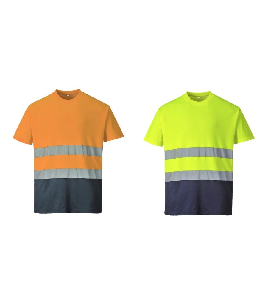 Fabric: 55% Cotton, 45% Polyester, Knit Features: • CE certified Description: Our ever-popular t-shirt has been redesigned to deliver a stylish two tone version. This t-shirt combines the benefits of high comfort, easy care fabric along with additional practical colour blocking. Sizes Small – 3XL in yellow/navy or orange/navy