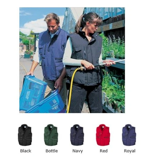 Polyester pongee rip-stop outer with PVC coating, polyester fibre wadding inner, double stitched seams, full zip front fastening, deep armholes with elasticated weather protectors, two triple access front pockets, 1 chest pockets, 1 chest pocket, 1 outside phone pocket and 1 inside pocket. Available in S, M, L, XL, XXL, 3XL in black, navy, and bottle