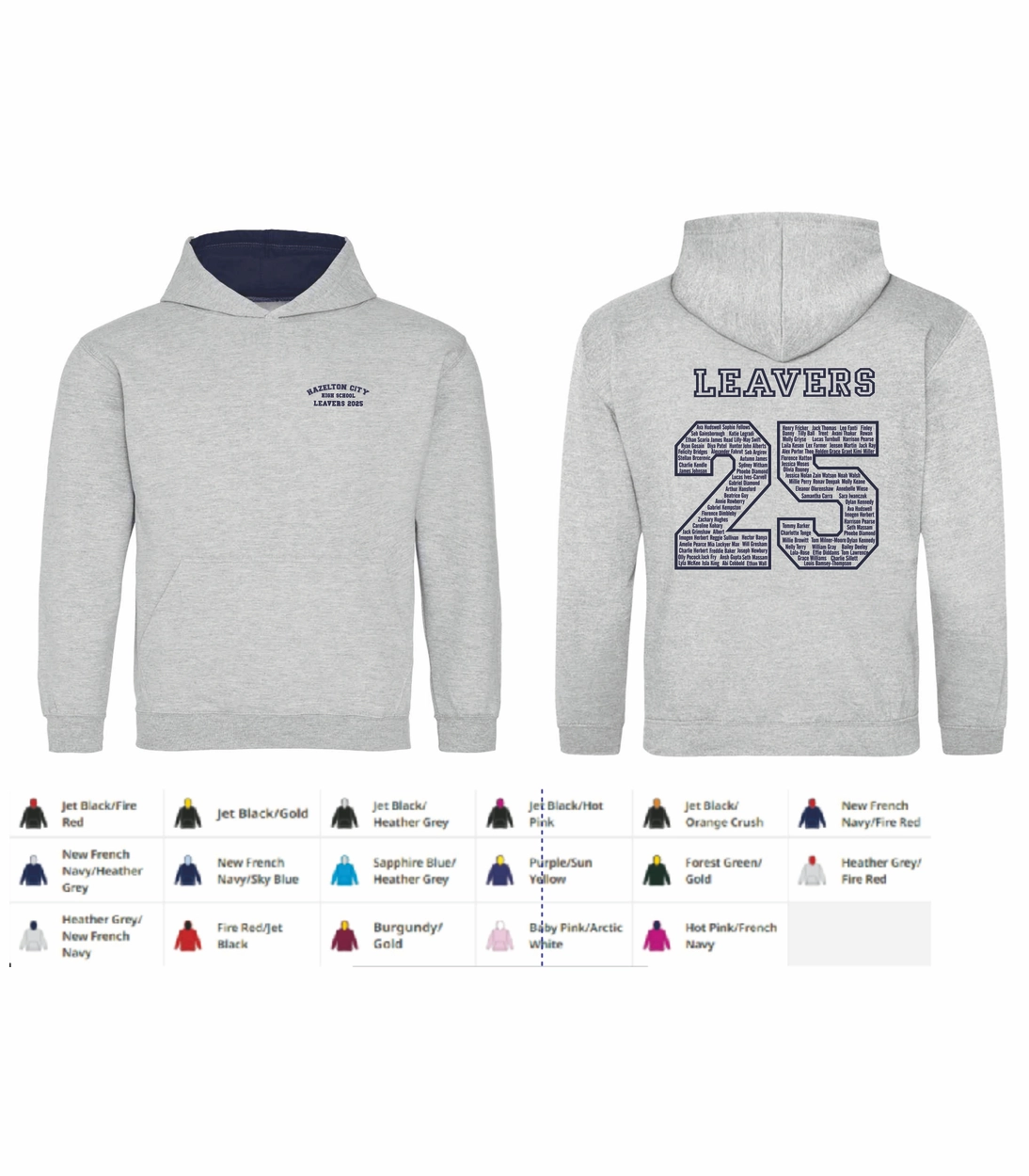 Screen printed with names on the back in the shape of year number  School name/logo printed or embroidered on front left hand breast School name or logo printed or embroidered on front left hand breast (embroidery +£1.000 and £15 one off set up).  Print colour white on dark colours or navy on light colours