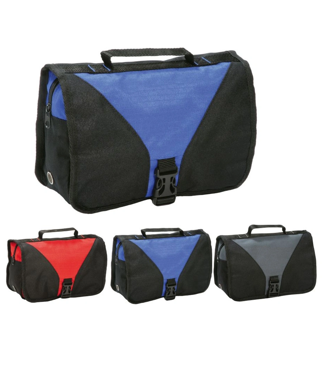 Durable 600D polyester, folding toiletry bag, 3.5 litre capacity, dimensions 25 x 9 x 17cm, available in grey/black, royal/black, red/black