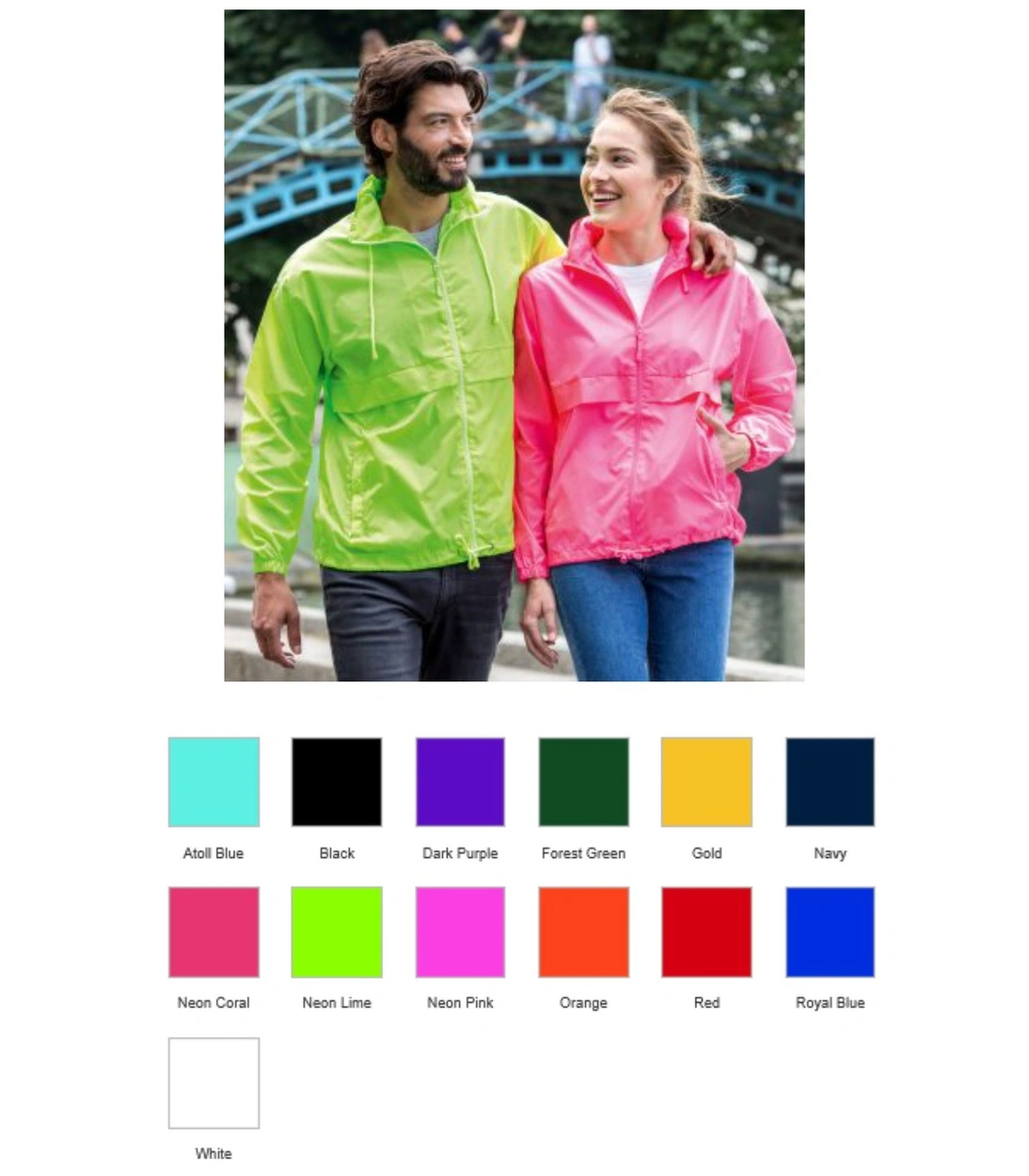 - Colours black, white, navy, royal blue, atoll blue, dark purple, forest green, neon lime, red, neon pink, neon coral, orange, gold